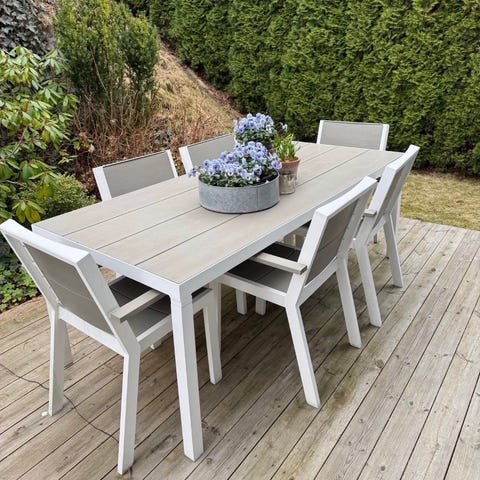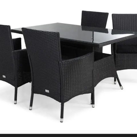 Rundt hagebord med fire stoler i matchende design. Møblene har lys grå/beige ramme og puter i tilsvarende lys farge. Bordet har rund plate i nøytral grå tone. Stolene har armlener og tykke sitte- og ryggputer for økt komfort. Passer til bruk på terrasse, balkong eller i hage som spise- og sittegruppe utendørs.
