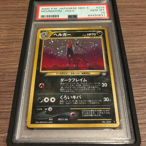 Pokémon japansk Houndoom 1st edition #071 fra Town On No Map gradert i PSA 9 med ny cert vurderes solgt. Trades kan også være aktuelt.