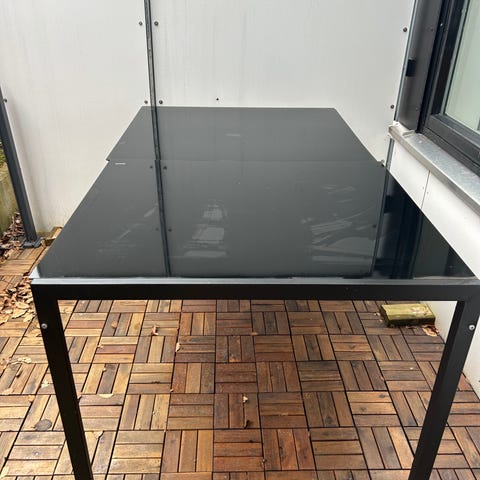 Svart hagebord med glassplate på toppen selges da vi har kjøpt oss et nytt bord. Bordet har blitt brukt i en del år, og det er derfor en del bruksmerker. Glassplaten har noen områder med misfarging. Et av beina har også sprukket litt.