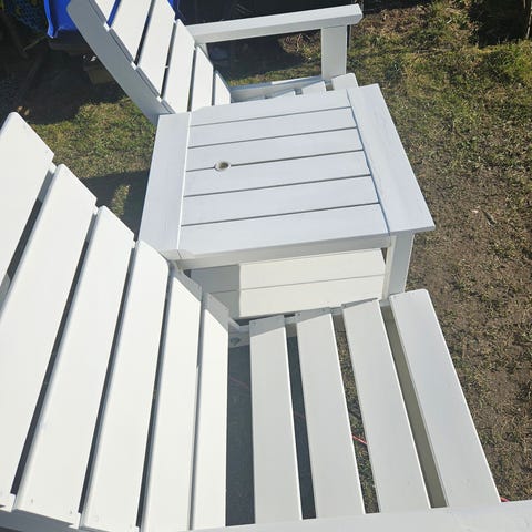 Selger 2 stk Adirondack stol fotskammel, da vi kun har plass for stolene selv. NB stolen i bilde selges ikke, kun fotskammel. 300kr stk