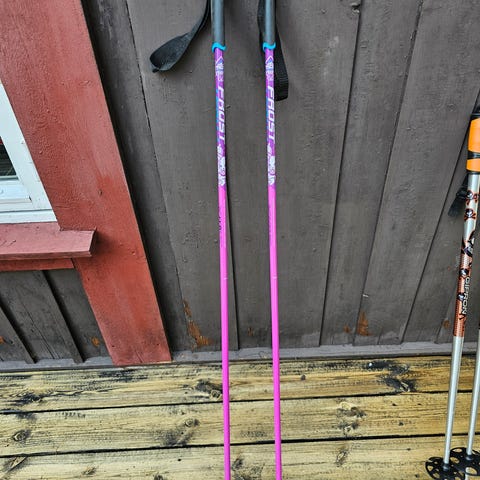Skistaver i 95 cm i lilla farge med turkise trinser. Stavene har spiss tupp og runde trinser som passer til langrenn. Selges til 100kr. Sender ikke, kan hentes Haugesund.