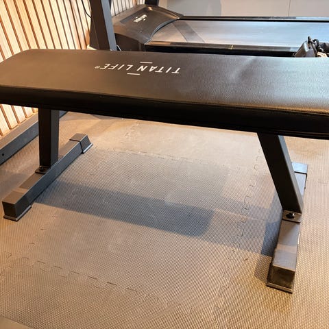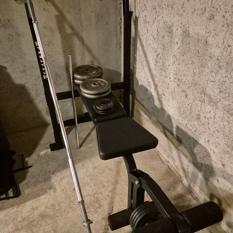 Maxfit treningsbenk med integrert vektstativ i. Benken har polstret liggeflate og justerbar del for overkropp og ben. Vektstativet har holdere for vektstang. Egnet til styrketrening som benkpress og andre øvelser med frivekter hjemme. Vektstang og vektskiver følger ikke med. Kan legges sammen.