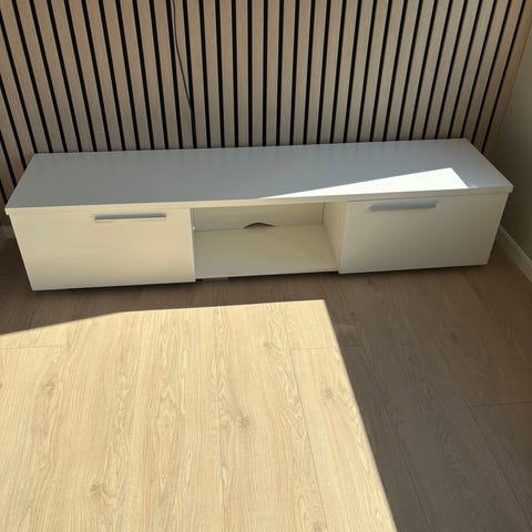 Fin tv bord, 180 cm lang og 48 cam høy. 2 store skuffer og 3 små i midten.