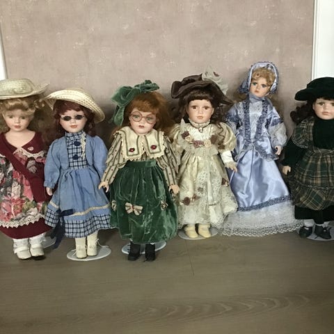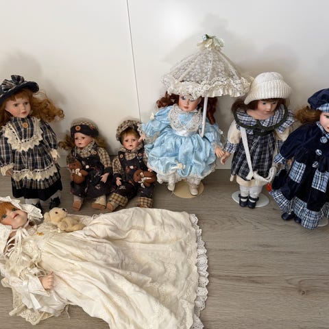 Sett med porselensdukker. Dukkene har klassiske kjoler i ulike mønstre og farger, blant annet blomstrete og rutete stoff i flere nyanser. De har langt hår i lys brun/rødlig tone og detaljerte klær med blonder, forklær og underskjørt. Noen av dukkene har sko og strømper, og én dukke står på metallstativ. Egner seg som pynt, samlerobjekter eller til rolig lek. Se bilder for detaljer på klær, hår og tilbehør. Den ene av dukkene har et ben som er litt ødelagt og en annen av dukkene har en arm som har løsnet og skiene er litt løse. (Se bilder)