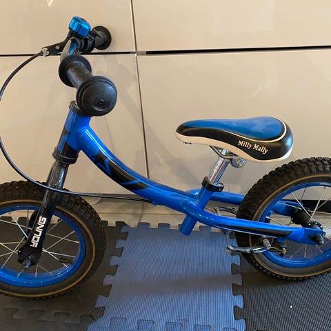 Barnesykkel / løpesykkel / balansesykkel med 12" hjul i blå farge. Sykkelen har lav ramme som gjør det enkelt for barnet å komme seg av og på. Sete og styre er utformet for små barn, og sykkelen passer godt som første sykkel for å øve balanse og koordinasjon.