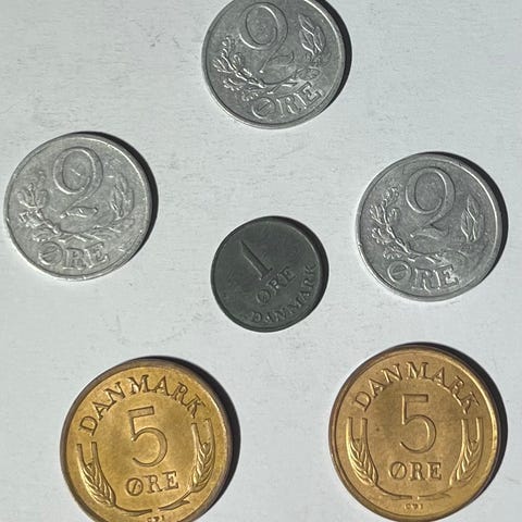 Danmark 2 øre mynter lot. Bildene viser fire danske 2-øre mynter med årstall fra 1960-tallet. Forsiden har påskriften «Danmark» og valør «2 øre» omgitt av kornaks. Baksiden har kongemonogram med krone og årstall. Myntene ser ut til å være i bronsefarget metall og har normal sirkulasjonsslitasje. Egner seg som samleobjekt eller til utvidelse av myntsamling av danske småmynter.