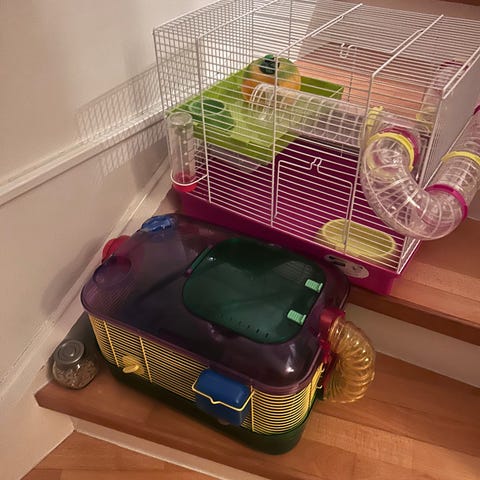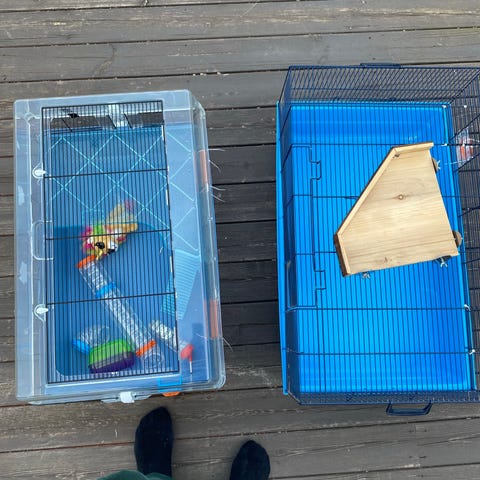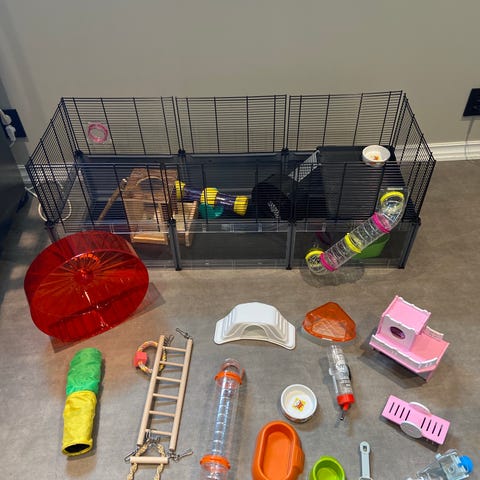 Smådyrbur med åpen topp og nettingvegger. Buret står på plastbunn og egner seg til små kjæledyr som gnagere eller kanin, avhengig av størrelse. Med følger transportbur i plast med lokk og lufteluker, samt diverse tilbehør som hus, leker og annet utstyr til smådyrhold. Settet gir grunnleggende utstyr til hold av smådyr i bur innendørs.