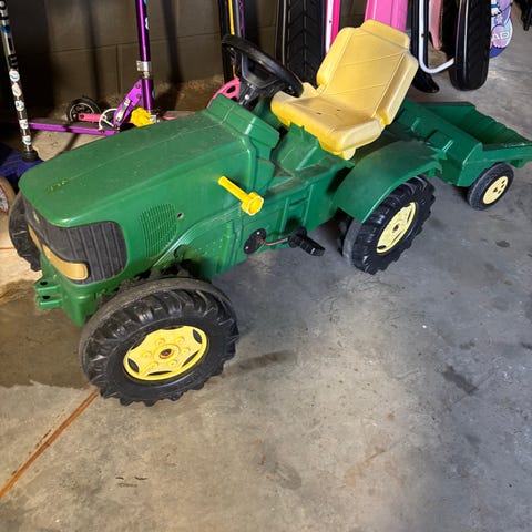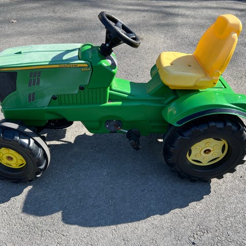 En godt brukt tråtraktor, med lufthjul. Fungerer bra, guttungen har elska den. Bremsen er tatt av, siden den ikke hadde noe funksjon (den følger selvfølgelig med). Det er en sprekk i rattet (se bilde). Det mangler en skrue til setet, men fungerer bra som det er, og det er sikkert lett å få tak i en ny. Den originale henger låsebolten har forsvunnet, men har en erstatter som fungerer bra. Det er slitasje under hengeren, påvirker ikke funksjonen (se bilde). Det er montert ekstra refleks (Biltema) på traktoren og hengeren.