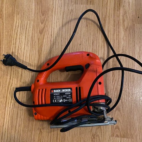 Black & Decker stikksag med ledning. Elektrisk stikksag egnet for kapping og utskjæring i tre og andre materialer, avhengig av type blad som brukes. Sagbladet er montert i front, og sagen har håndtak med bryter på toppen. Strømtilkobling via vanlig støpsel. Passer til generelle gjør‑det‑selv‑oppgaver i hjem og garasje.
