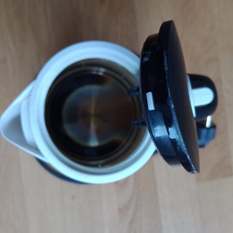 Menuett vannkoker i glass med svart plastlokk og -håndtak. Kannen har synlig vannivå og blått lys under oppvarming. Basen og nederste kant er i metallfarge. Vannkokeren er egnet til koking av vann til te, kaffe og annen drikke, samt til matlaging der kokende vann er nødvendig.