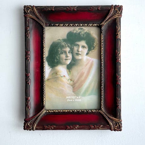 Gammal/vintage bilderamme i tre med naturleg slitasje og synlege lag av maling, som gir eit rustikt og levd uttrykk.