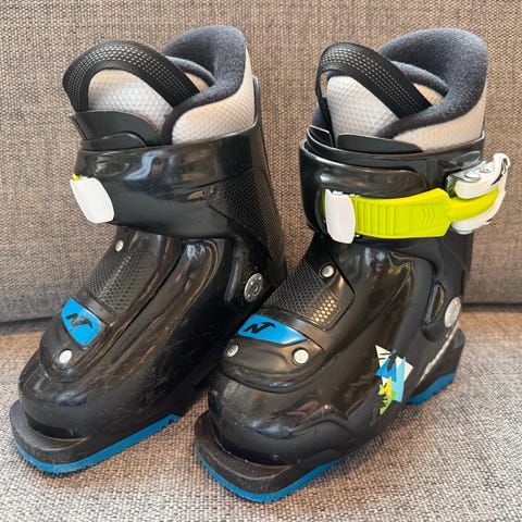 Nordica Firearrow Team alpinstøvler for barn i størrelse 220–225 mm (sålelengde 275 mm). Modellen har to spenner og powerstrap øverst for å gi god støtte rundt ankel og legg.