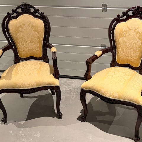 Stolene har vakre, håndskårne detaljer, cabriole-ben og en klassisk, fransk-inspirert silhuett. De passer godt både som spisebordsstoler eller som dekorative innslag i et mer kuratert interiør.