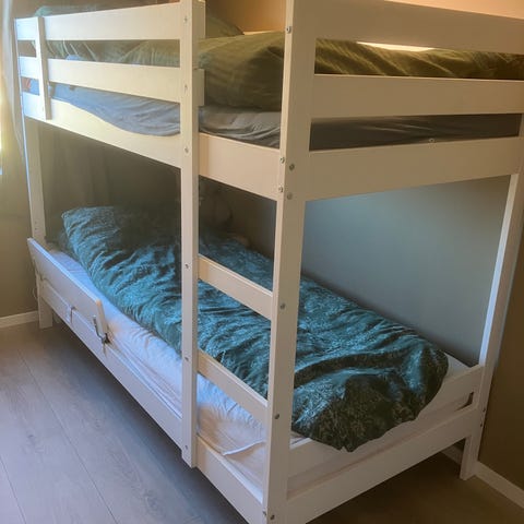 Madrass kan medfølge om ønskelig, for 850 kr ekstra. Madrassen er knapt brukt, og er Hoppekids madrasskjerne 70x190x9 cm kaldskum, med luftspalter for optimalt klima. Inkl madrasstrekk.