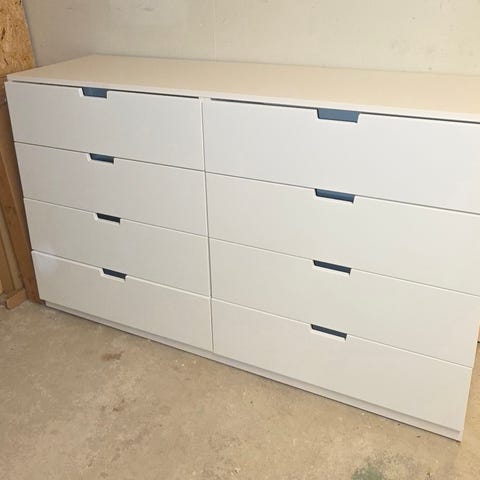 Selger en stor og praktisk kommode fra NORDLI-serien til IKEA. Kommoden er i god stand og har svært mye oppbevaringsplass i ulike skuffestørrelser, perfekt for både soverom, gang eller stue. Kommoden er pent brukt, men har et par små skjønnhetsfeil (se bilder). Et lite skrap på topplaten og noen bruksmerker på kanten av den ene skuffen. Dette kan enkelt skjules med en hvit møbeltusj.