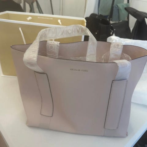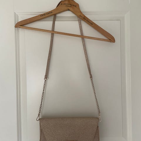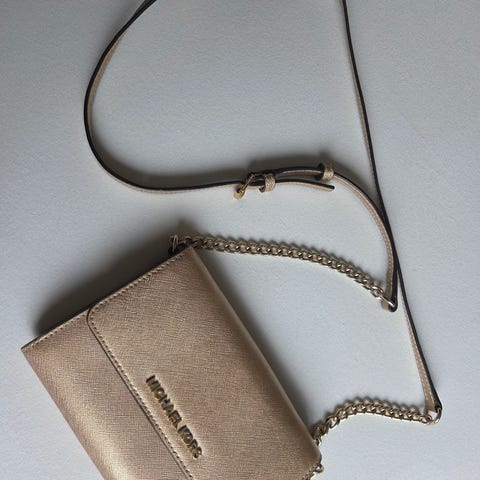 Michael Kors skulderveske i rosa med klaff og lenkedetalj. Fin, enkel form med justerbar rem og et rent uttrykk. Lengde 24cm, høyde 17cm