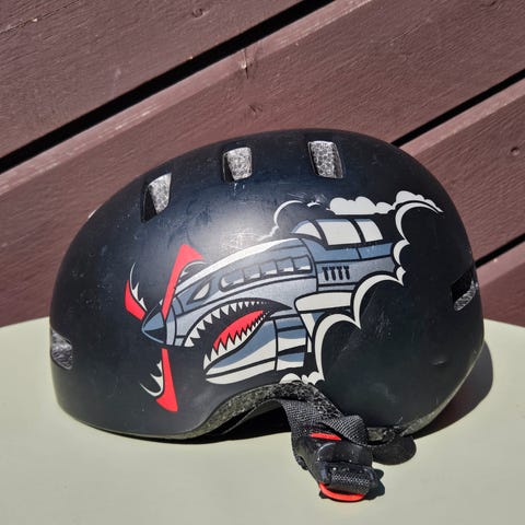 Lil Rider sykkelhjelm i størrelse 48–52 cm. Hjelmen er svart med haimotiv på siden. Den har ventilasjonsåpninger på toppen og justering bak for bedre passform. Innvendig polstring gir økt komfort. Egnet som beskyttelseshjelm for barn ved sykling, sparkesykkel og lignende aktiviteter innenfor angitt størrelsesområde.