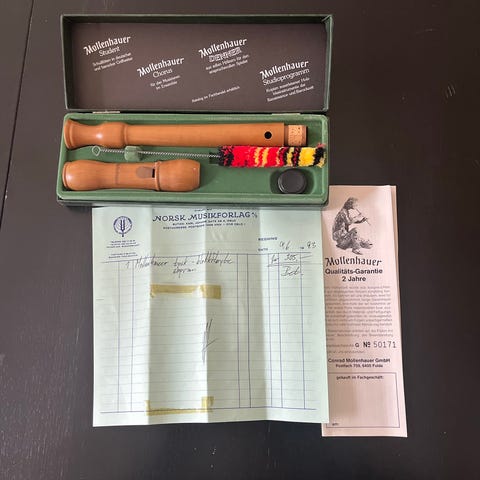 Tussefløyte i tre og Hohner Alt-blokkfløyte i plast med tilhørende etui. Settet inkluderer også flere hefter med noter og øvingsmateriale for tussefløyte og blokkfløyte. Selges helst samlet.