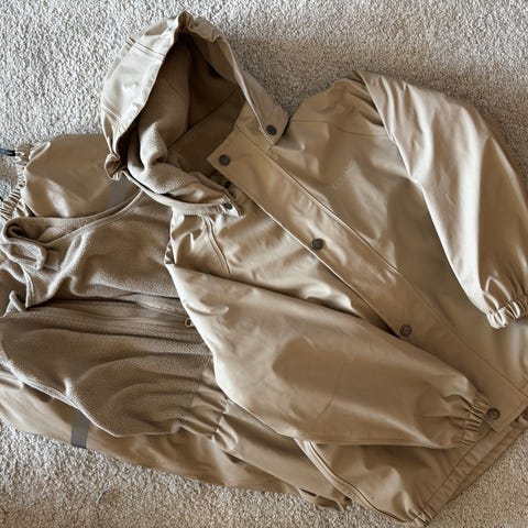Kuling regntøysett for barn i størrelse 128. Sett bestående av jakke og bukse i oransje polyester. Jakken har hette, glidelås med trykknapper, elastikk nederst og på ermene, samt refleksdetalj bak. Buksen har strikk i livet og nederst på bena, samt refleksdetaljer. Passer til jente og er egnet som yttertøy i vått vær.