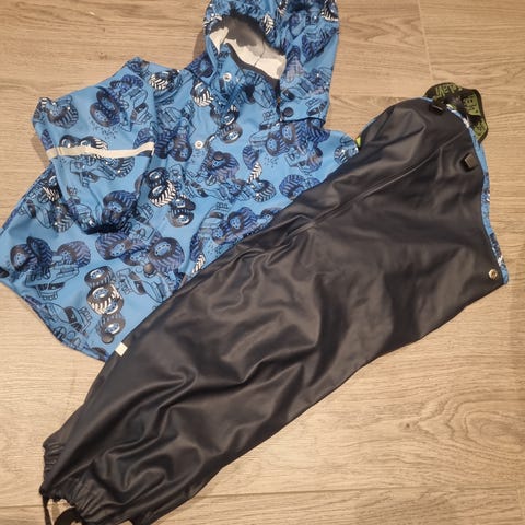 Pyttelitt regnbukse for barn i mørk blå farge. Regnbuksen har seler med justerbare spenner og strikk nederst ved bena. Det er fotstrikker under føttene for å holde buksen på plass. Refleksdetaljer nederst på bena gir bedre synlighet. Passer til bruk i vått vær og som ytterlag over andre klær.