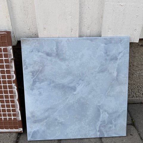 Mønstrede keramiske fliser i grå og hvit farge. Ca. 125 stk. Mange har rester av lim/mørtel på baksiden etter tidligere montering. De er skitne og må vaskes. Se bildet. Kan ses og hentes i Vollen :)