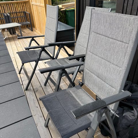 Hage-/balkongsett med bord og to stoler med puter. Stolene har mørk ramme og høyt ryggstø, med løse, polstrede sitte- og ryggputer i lys grå tekstil. Bordet har mørk overflate med ribbet bordplate. Settet egner seg til bruk på balkong, terrasse eller i hage som sittegruppe for to personer.De er ikke brukt mer en mnd.