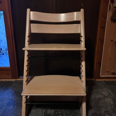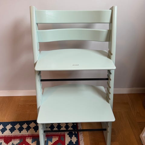 Har noen en Stokke Tripp Trapp barnestol i eik, warm Brown, grå eller grønn som vil bytte med denne i Soft mint. Denne er brukt i et år, finner ingen bruksmerker.