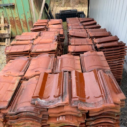 Rød keramisk takstein. Egner seg til tekking av skråtak på bolig, garasje eller til utskifting av enkeltstein. Taksteinen har tradisjonell profil og er laget for montering på lekter på vanlig undertak. Antall stein og eksakte mål kan kontrolleres ved henting eller etter nærmere avtale med selger.