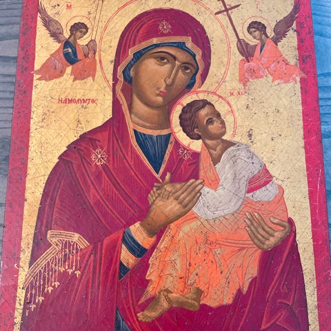 Madonna med barn ikonmaleri på tre. Motiv av Maria med Jesusbarnet, inspirert av ortodoks ikontradisjon. Begge ikonene er malt på rektangulære treplater med gyllen bakgrunn og detaljer i røde, blå og gullfarger.