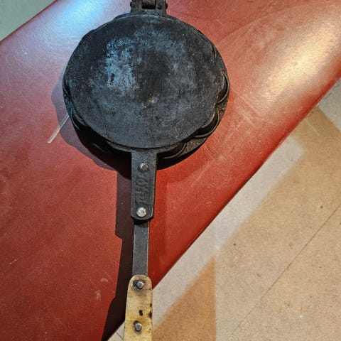 Vaffeljern laget i støpejern med langt skaft og håndtak i tre. Det følger med et tilpasset etui/trekk med Espegard-logo. Egnet til bruk over bål eller grill for tilberedning av vafler og enkle toast varmretter utendørs.