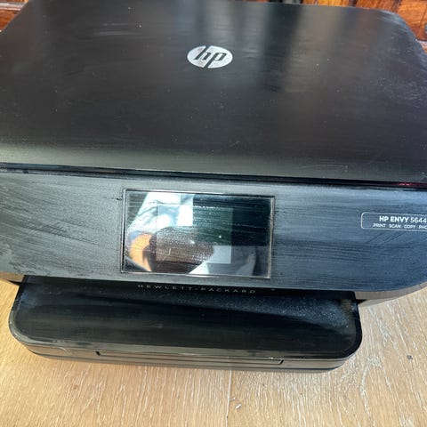 Skriveren har frontbetjening med display og knapper for enkel tilgang til funksjoner. Det følger med strømkabel og flere blekkpatroner slik det vises på bildene.