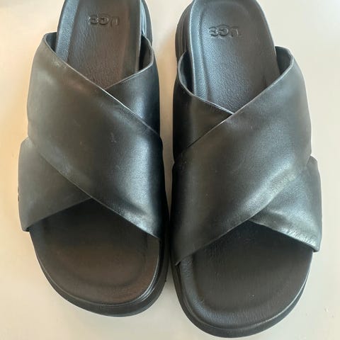 Flytte salg se gjerne mine andre annonser UGG sandaler med kilehæl i størrelse 39. Modellen har brune remmer over foten og rundt ankelen med justerbar spenne. Sålen har flettet, tauinspirert ytterside og gummisåle under for bedre grep. Åpen tå og hæl gjør dem egnet som sommersko til hverdagsbruk eller enklere penere anledninger.