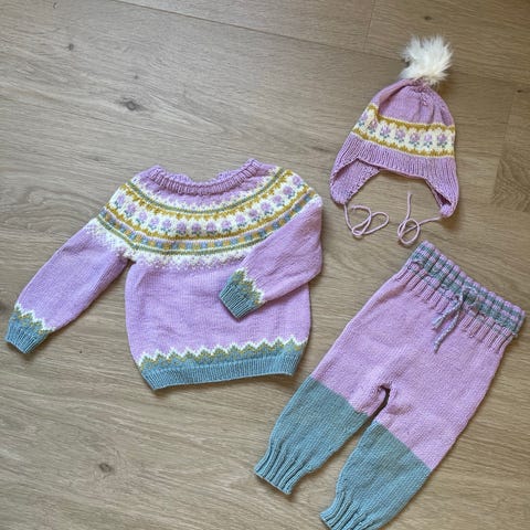 Genser, sokker, lue og hals. Passer fra kanskje 9 mnd og nærmere ett år. Vi brukte det til over året også. Ingen flekker. Ikke så mye nupper heller.