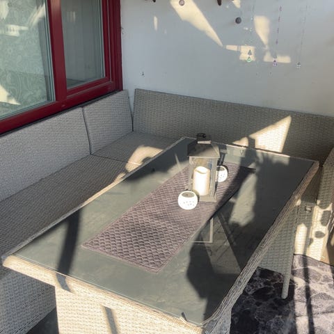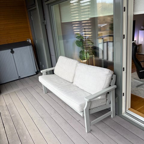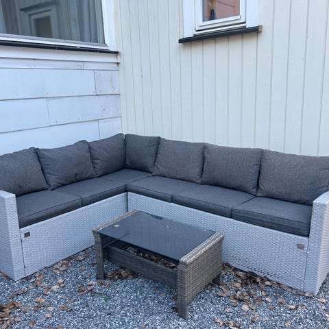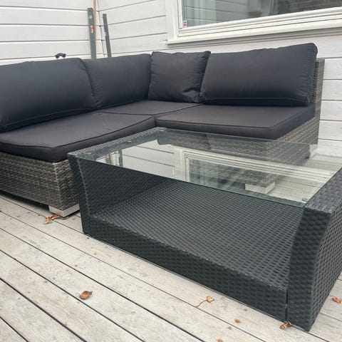 Sofaen har noen slitemerker på hjørnene, og den ene sitteputa trenger og sys bak eller byttes. Dette synes ikke når den ligger i sofaen og har lite å si for bruken. Det er også to små hull i rottingdelen av bordet, men dette påvirker heller ikke bruken ☺️