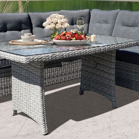 Hjørnesofa utemøbel i brun kunstrotting med grå sitte- og ryggputer. Sofaen er utformet som en hjørneløsning med armlener på hver ende. Medfølgende lavt bord i matchende brun kunstrotting og glassplate på toppen. Egnet for bruk på terrasse, balkong eller i hage som sittegruppe utendørs.