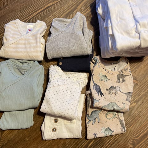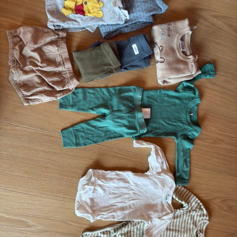 2 sett joha Ullklær i størrelse 70. Finner ingen hull, noe slitasje kan forekomme. Litt misfarging øverst i kragen på bodyene og den hvite har noen flekker. Ikke forsøkt fjernet annet enn ved vanlig ullvask. Pent brukt av ett barn. Følger med en ullsmekke