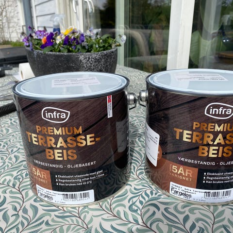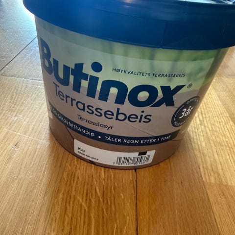Jotun Trebitt Terassebeis Lasur. Maling til terasse i tre gråfarger selges etter å ha prøvd ut litt forskjellig på egen terasse. Alle tre er nesten fulle. 100 kr per, 250 for alle :)