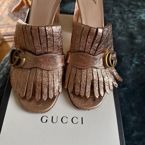 Gucci GG Marmont Fringe Mules, en populær modell i semsket skinn med den karakteristiske doble G-logoen og frynsedetaljer. Pent brukt i strl 40. Følger med eske, dust pose som skoene har vært oppbevart i og kvittering.