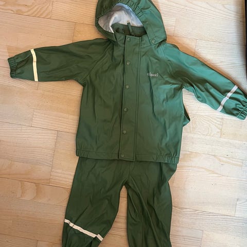Didriksons regntøysett for barn i størrelse 110, unisex. Sett med jakke med hette og selebukse i grønn farge. Materiale i polyester. Refleksdetaljer på ermer og ben for bedre synlighet. Egnet som yttertøy i vått vær for barnehage og utelek. Lite skrap på baken av buksen.