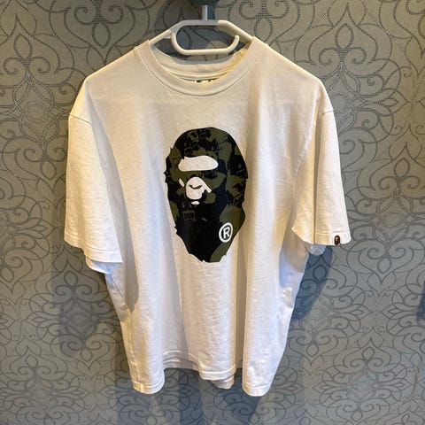 A Bathing Ape t-skjorte for herre i størrelse S. T-skjorten er hvit og laget av bomull. Fronten har trykk med A Bathing Ape-logo og motiv i kontrastfarger. Kortermet modell med rund hals. Passer til hverdagsbruk og kan kombineres med ulike typer bukser og jakker.
