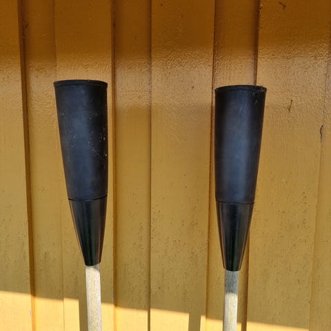 hagefakler med svart stang og betongfot. Faklene står stødig i tunge betongbaser som egner seg for plassering på terrasse, platting eller fast underlag utendørs. Passer til bruk med fakkelolje eller lignende brennstoff etter produsentens anvisning. Selges som sett slik de fremstår på bildene.