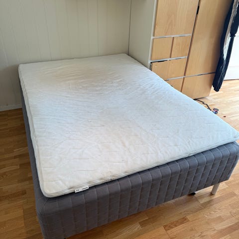 IKEA madrass i lys farge. Standard rektangulær madrass med vertikale sømmer i trekket.
