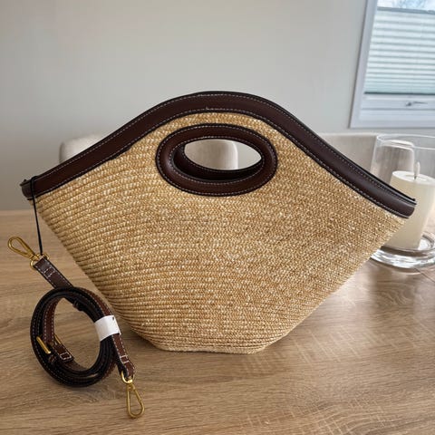 Parfois stråveske for dame. Vesken er laget i flettet stråmateriale med åpne ruter og har doble skulderremmer i imitert skinn. Innvendig har den lyst tekstilfôr med glidelåslomme og åpen lomme for småting. Passer som hverdagsveske eller til strand og fritid, med plass til nødvendigheter som lommebok, telefon og sma personlige eiendeler.