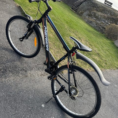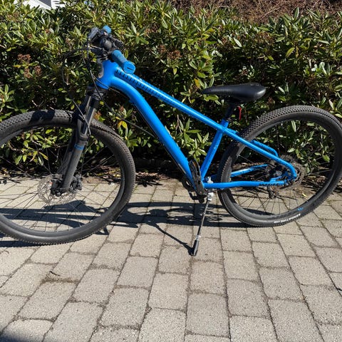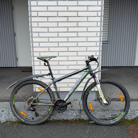 Denne terrengsykkelen er i veldig god stand. Den har nye dekk, to seter og et bakre bagasjebrett som er perfekt for handleposer. Syklingen er jevn og pålitelig.
