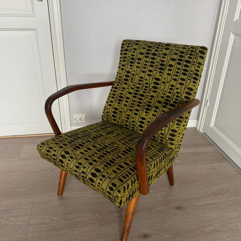 Synlig brukt lenestol selges pga flytting. Klassisk 1960-tallsdesign med høy rygg og oransje-rutete trekk. Den er noe slitt her og der i stoff og treverk, men dette er ting som kan fikses opp med litt godt stell.