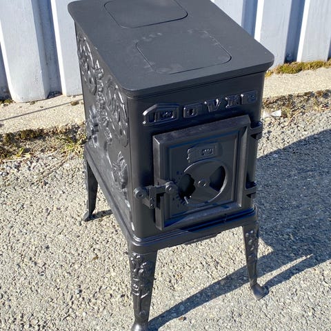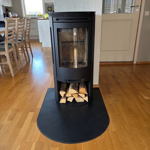 Frittstående vedovn i svart stål med buet front og glassdør. Ovnen har askeskuff og håndtak i metall, samt røykrør som går bakover til vegg. Over brennkammeret er det en hylle med ildfaste steinplater. Passer til montering på brannfast underlag i stue eller andre oppholdsrom der det er tilkoblingsmulighet til pipe.