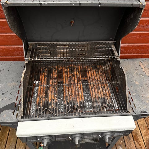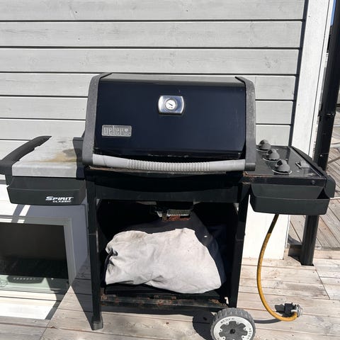 Weber gassgrill i svart farge med lokk og innebygd termometer. Grillen har rist i metall og praktisk sidebord på den ene siden.. Gasskobling og regulering er synlig på bildene. Tenner fungerer ikke, men en skikkelig vask på denne, så er det håp.