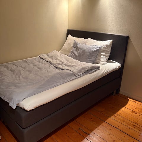 Bohus oppbevaringsseng i grå tekstil. Sengen har oppfellbar madrassdel med romslig oppbevaringsplass under. Nøytralt design som passer inn i de fleste soverom. Leveres med sengegavl i lyst treverk med spiler, som gir et enkelt og moderne uttrykk.