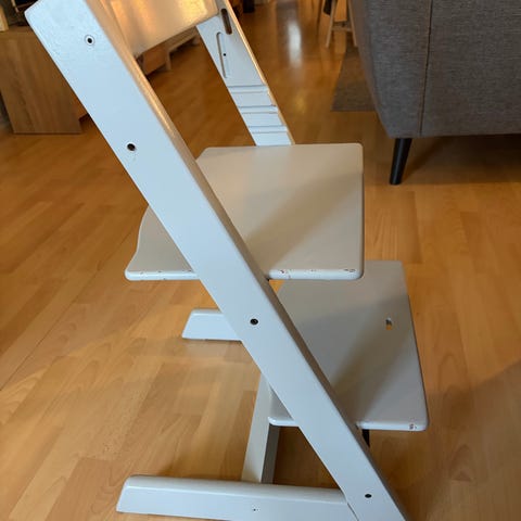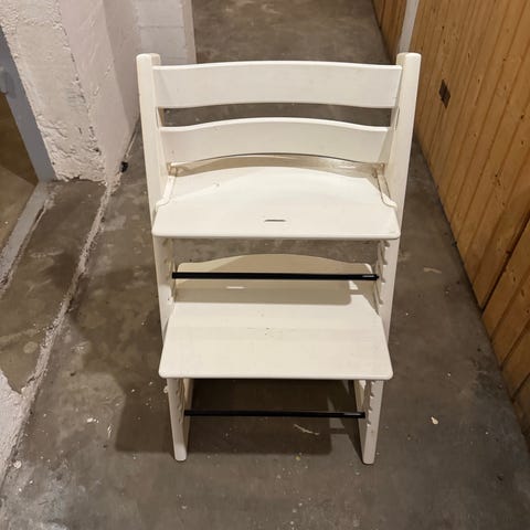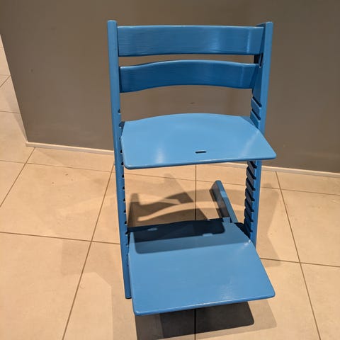 Stokke Tripp Trapp høy barnestol i lys blå farge. Klassisk trappeformet barnestol med justerbart sete og fotbrett som kan tilpasses barnets høyde. Stolen er laget i tre og er konstruert for å gi god sittekomfort ved bordet. Egner seg til bruk ved spisebord eller arbeidsbord for barn i ulike aldre, avhengig av montering og tilpasning.