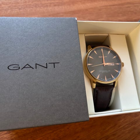 Gant herreklokke med rund urskive og analog visning. Klokken har mørk urskive med markerte timemarkeringer og egen sekundviser. Kassen er i metall med Gant-logo på baklokket. Remmen er i svart skinn med justerbar lengde og klassisk spenne. Passer som hverdagsklokke til herre.